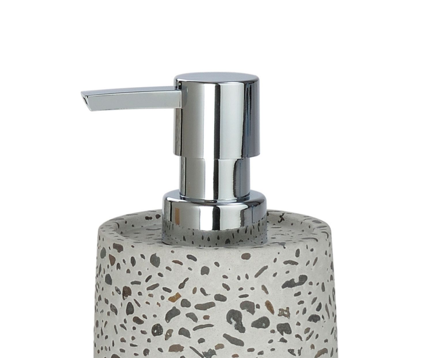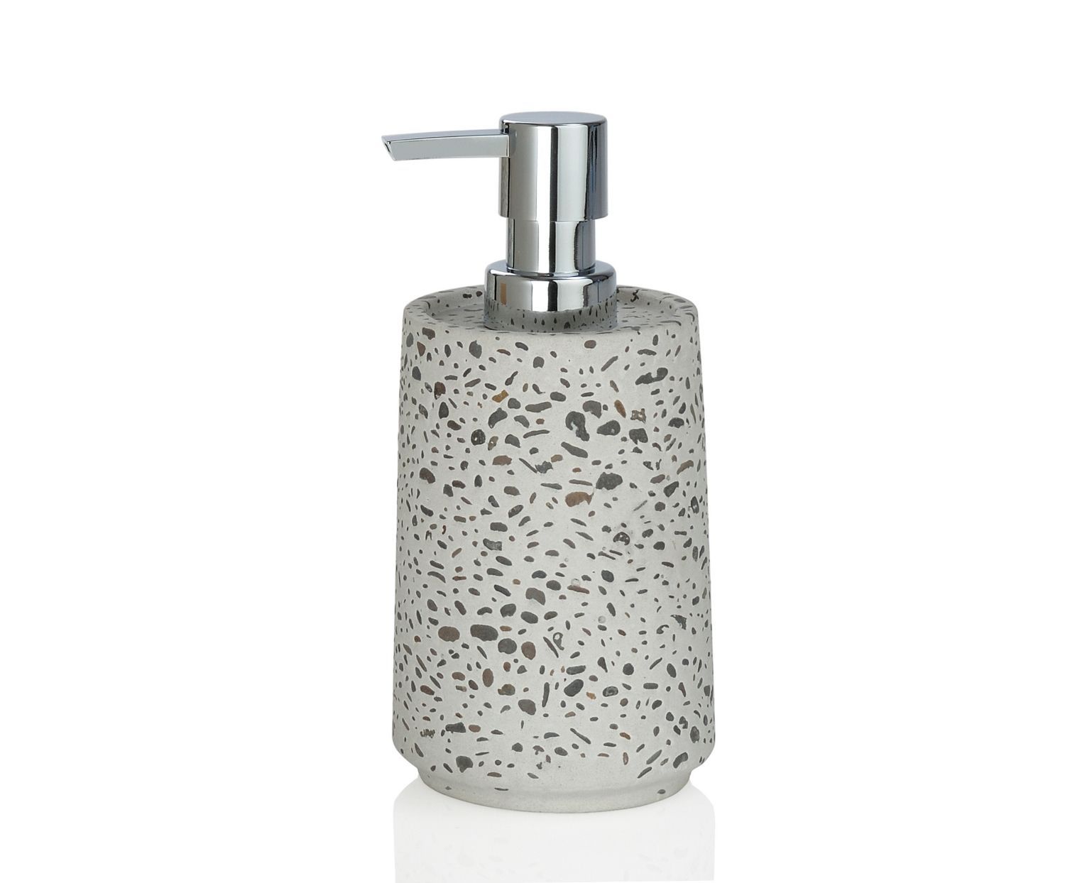 Диспенсер для жидкого мыла из полирезина с имитацией фактуры серого цемента со вкраплениями, дозатор с эффектом хромированного металла.