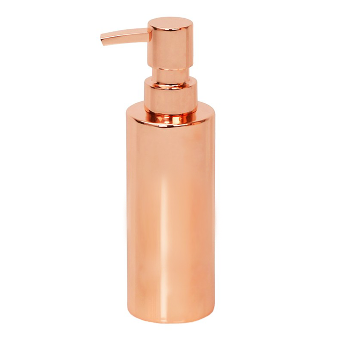 Диспенсер для жидкого мыла в форме цилиндра из полированного металла медного цвета.