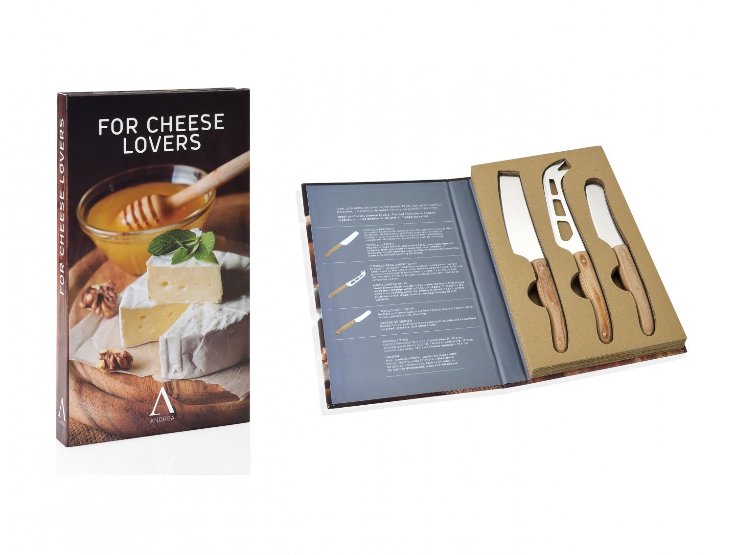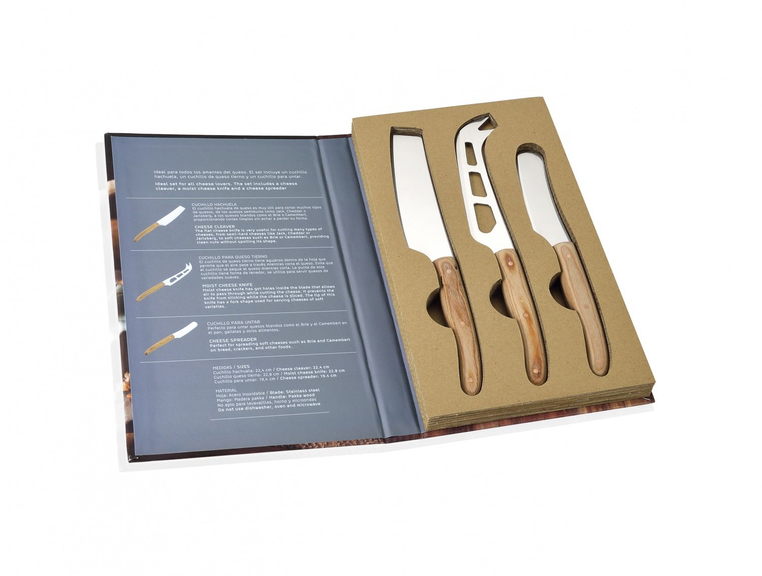 В набор ножей для сыра из нержавеющей стали и дерева акации входит слайсер для нарезки твердых и полутвердых сыров, нож-вилка с зубчиками и нож-лопатка - для мягких сыров. Круглые прорези на лезвиях ножей для сыра не только напоминают дырочки в маасдаме, но и уменьшают площадь соприкосновения ножа с продуктом, облегчая нарезку и предотвращая слипание слоев мягкого сыра – ведь его вкус меняется от корочки вглубь головки. Ножи упакованы в специальную подарочную коробку в виде книги и могут стать прекрасным подарком для любителей сыра.
