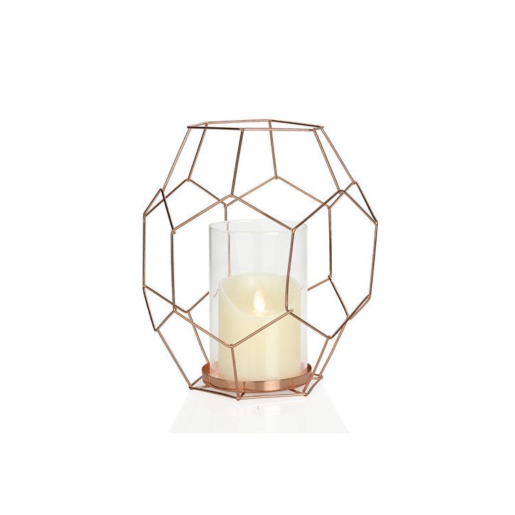 Подсвечник с круглым основанием из полированного металла медного цвета, цилиндрическим стеклянным экраном и решеткой с рисунком сот.