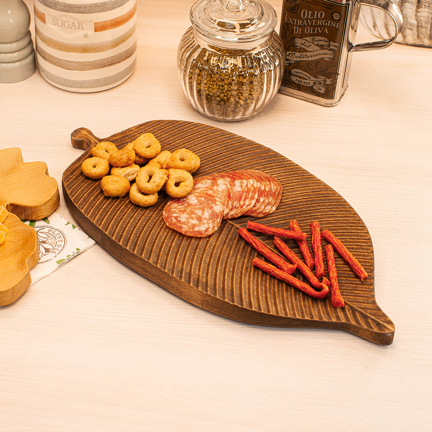 Деревянное блюдо для сервировки в форме фактурных листев - практичное и необычное решение для придания изысканности и уюта на Вашей кухне! Можно найти разное применение блюда: в качестве декора, разделочной доски, тарелки для сервировки. Наше сервировочное блюдо применяют для подачи сыра, фруктов, сладостей. Его также можно использовать как плато для суши, мяса или рыбы. Высокое качество натурального дерева позволяет перевернуть сервировочную доску и использовать ее в качестве разделочной. Деревянное блюдо для подачи выполнено из натурального Ясеня, древесина которого имеет уникальную текстуру и цвет, ценится за износостойкость и прочность, а также обладает эффектным внешним видом.