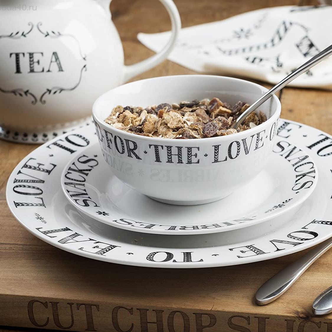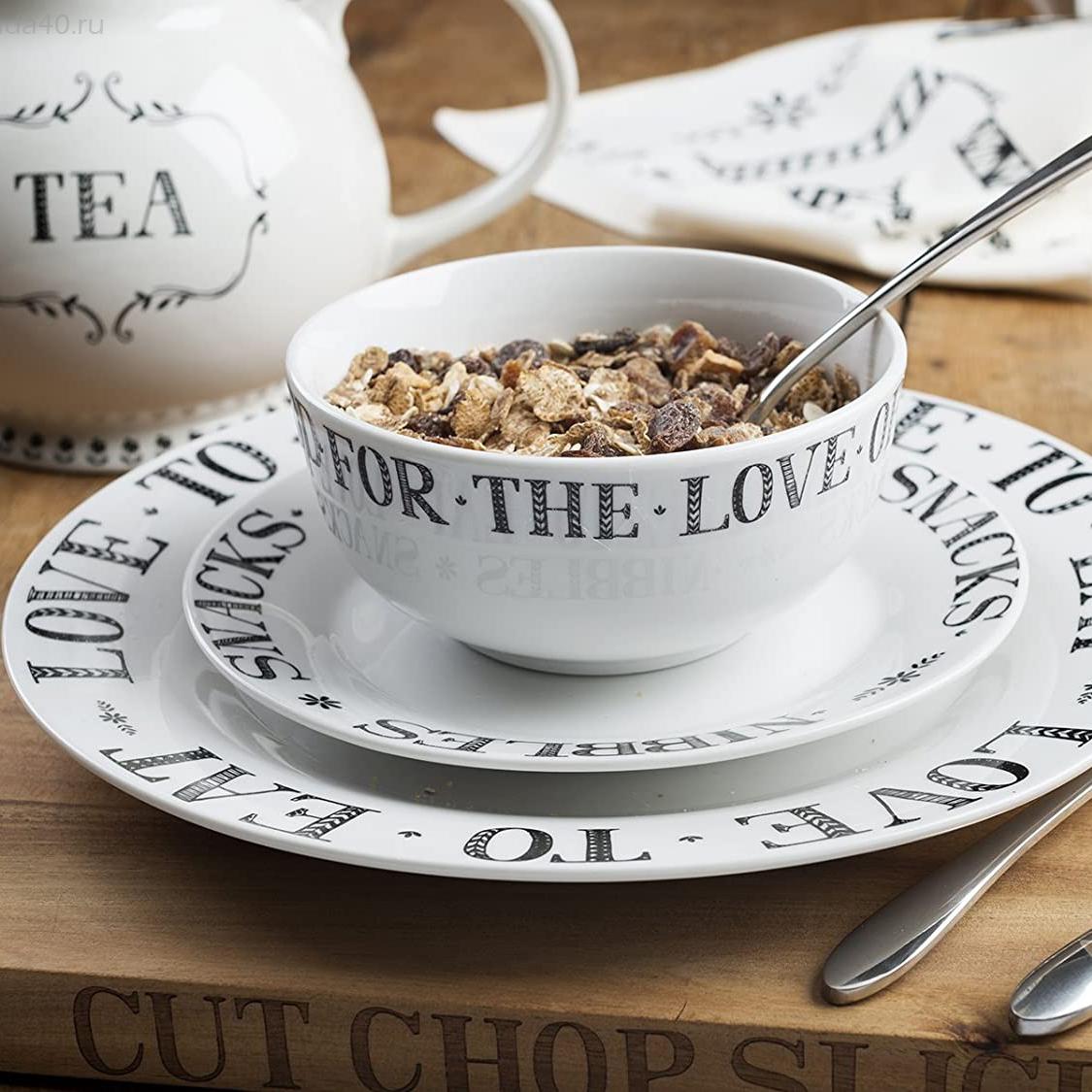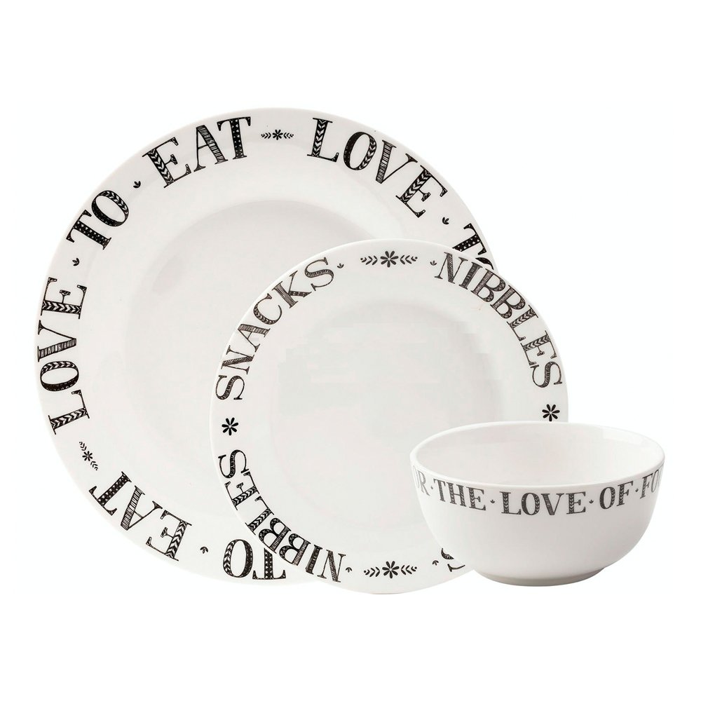 Набор столовых посуды из 12 предметов Stir It Up привносит современную причудливость в деревенский завтрак и обеденный стол. Классические тона цвета слоновой кости и черного сочетаются с просто стильными, нарисованными от руки лозунгами, такими как «For The Love Of Food» и «Love To Eat».