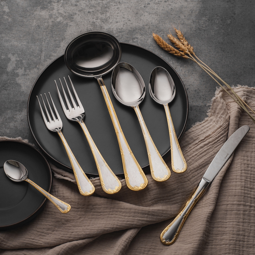 Luigi XVI Oro — это коллекция столовых приборов, посвященная временам правления Людовика XVI. Закругленные ручки с золотой окантовкой и элегантный декор в духе французского неоклассицизма прекрасно пойдут для праздничной сервировки стола.