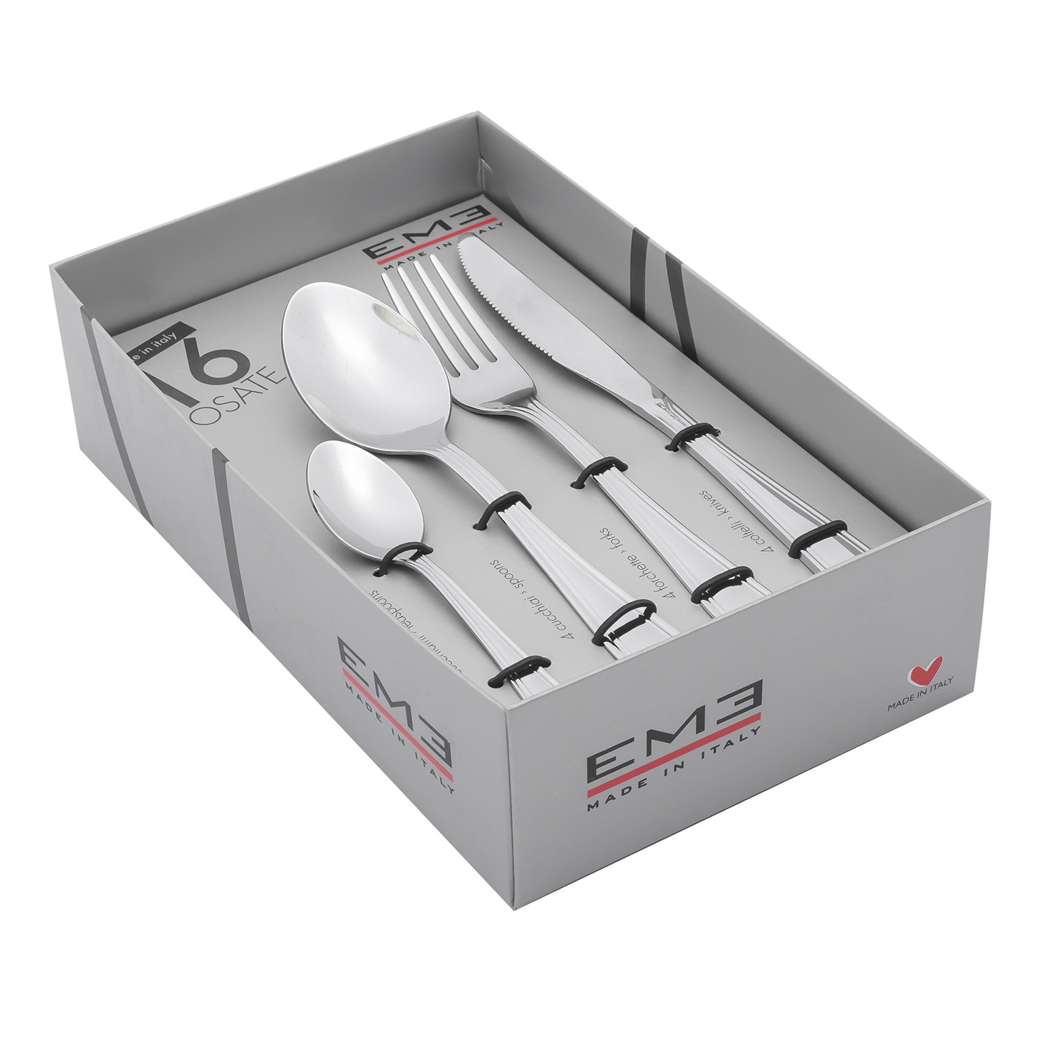 Набор EME City состоит из: 4 столовых ложек, 4 вилок, 4 столовых ножей и 4 чайных ложек. Все приборы изготовлены из нержавеющей стали 18/10 с глянцевой поверхностью и могут использоваться как для праздничной, так и для повседневной сервировки стола.
