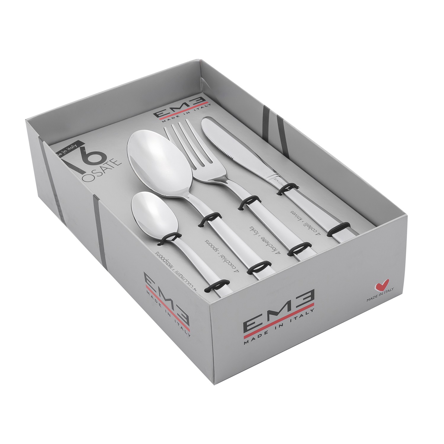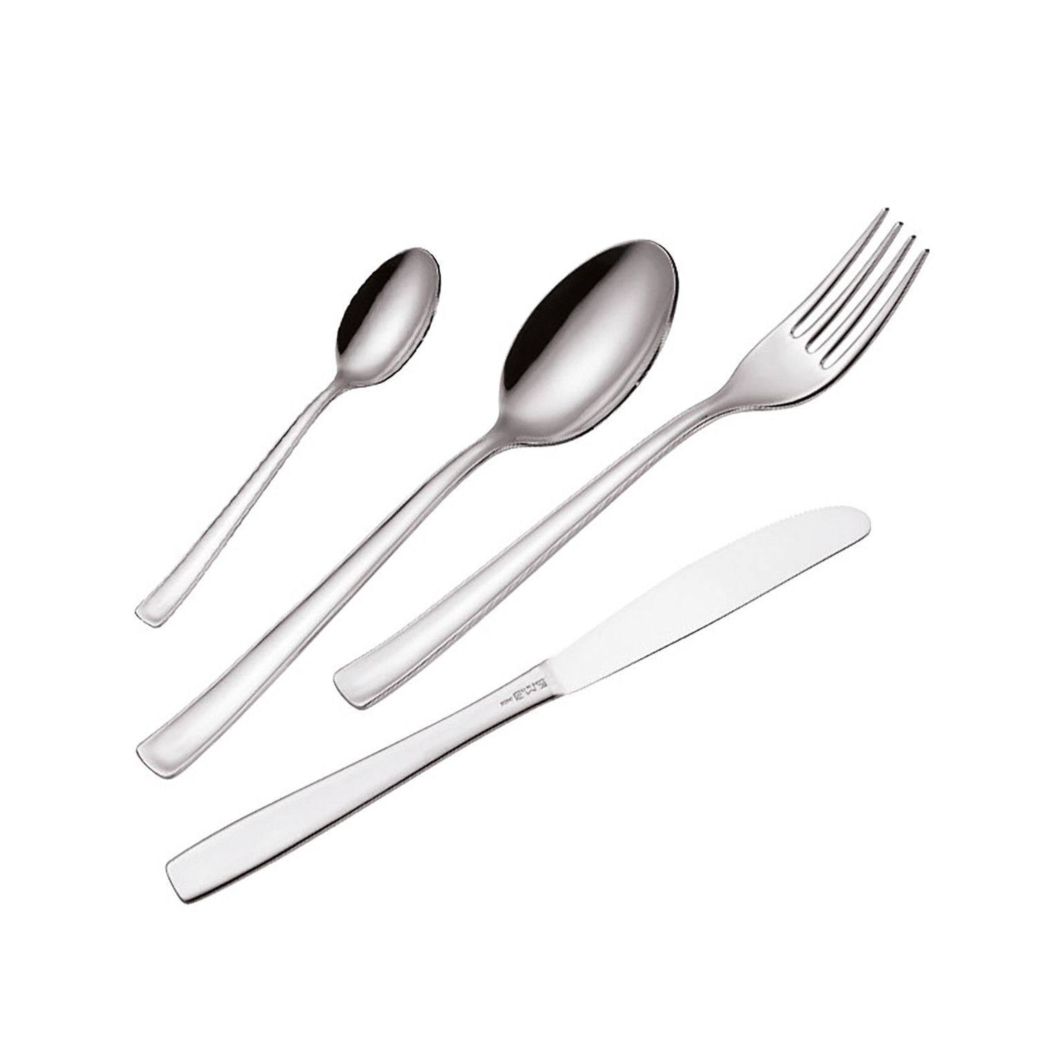 Набор EME Duna состоит из: 4 столовых ложек, 4 вилок, 4 столовых ножей и 4 чайных ложек. Все приборы изготовлены из нержавеющей стали 18/10 с глянцевой поверхностью и могут использоваться как для праздничной, так и для повседневной сервировки стола.