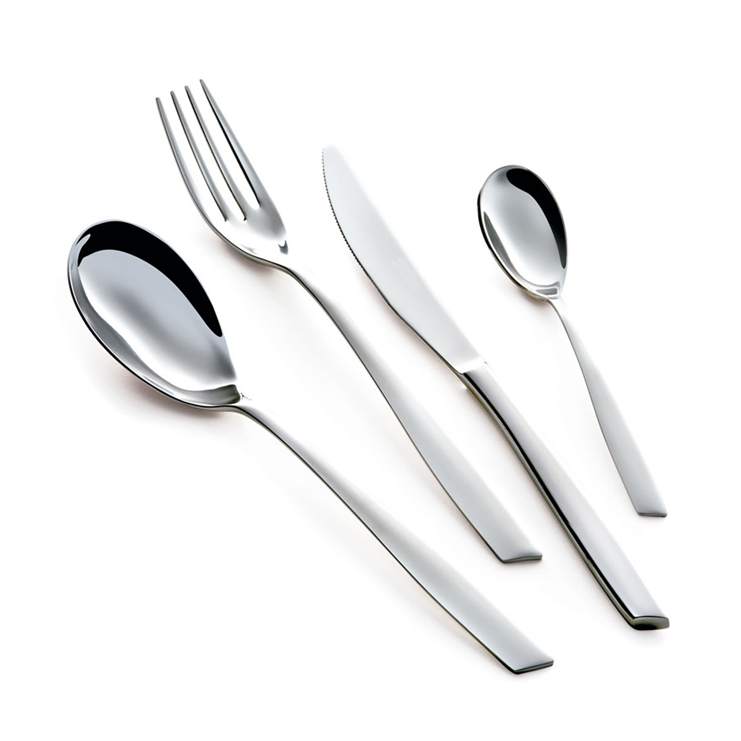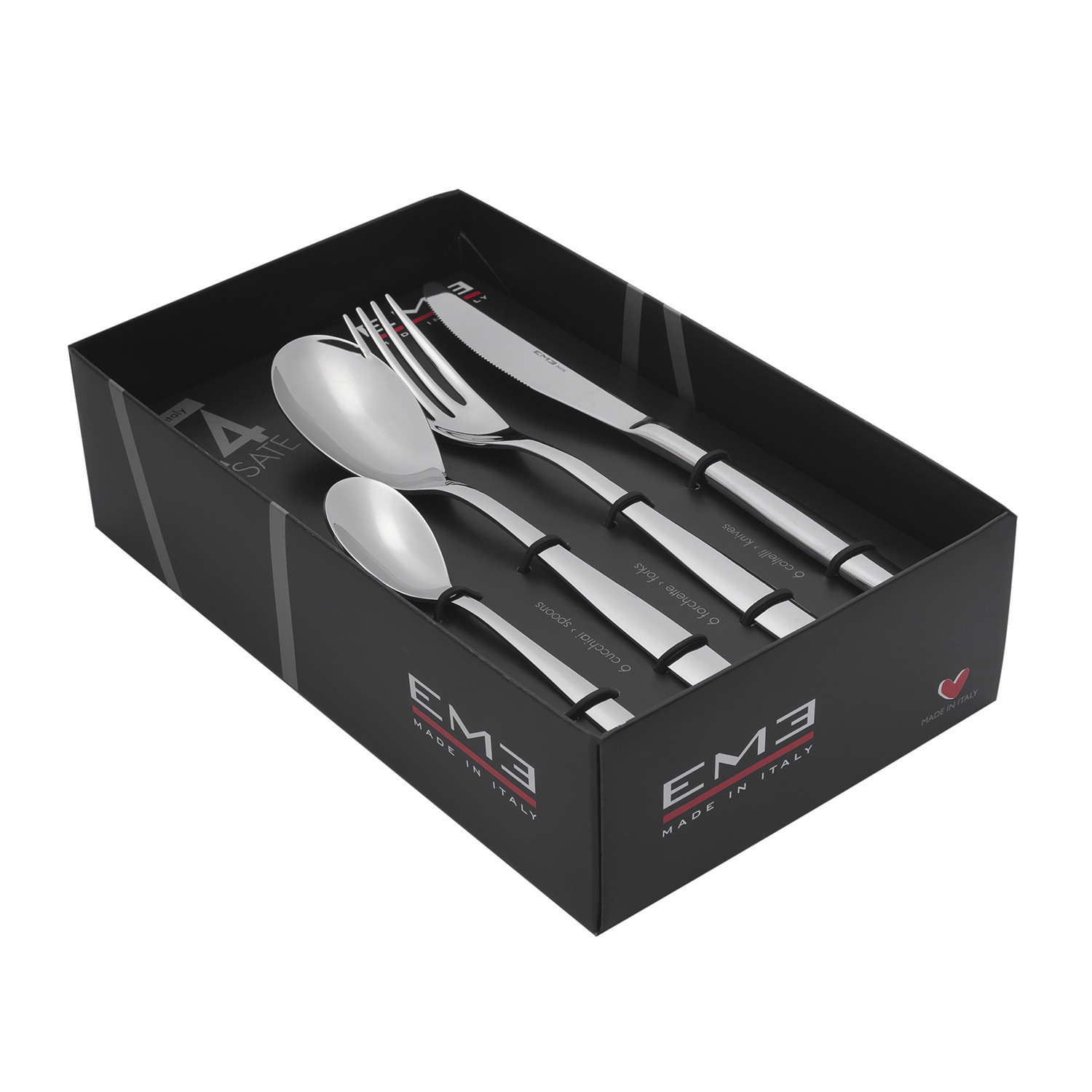 Набор EME Eleven состоит из: 6 столовых ложек, 6 вилок, 6 столовых ножей и 6 чайных ложек. Все приборы изготовлены из нержавеющей стали 18/10 с глянцевой поверхностью.