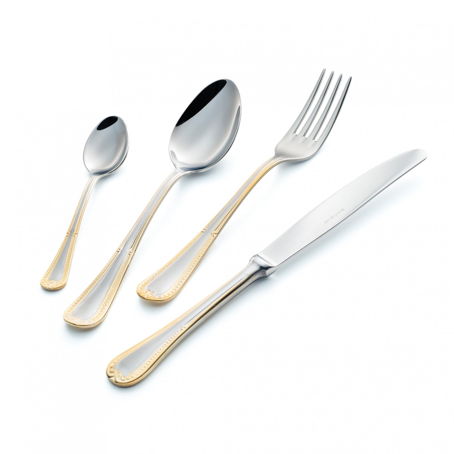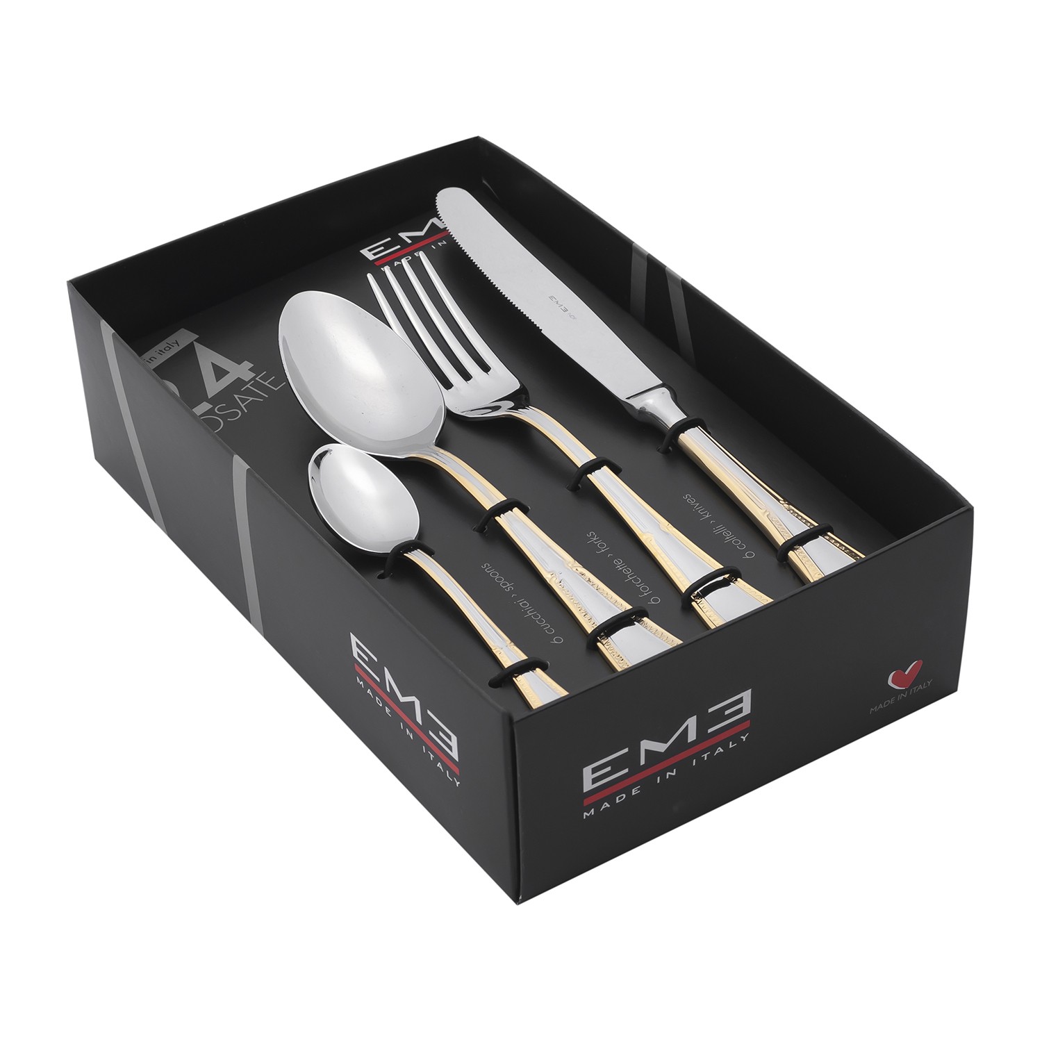 Набор EME Firenze Oro состоит из: 6 столовых ложек, 6 вилок, 6 столовых ножей и 6 чайных ложек. Все приборы изготовлены из нержавеющей стали 18/10 с глянцевой поверхностью и позолоченной окантовкой, нанесенной вручную.