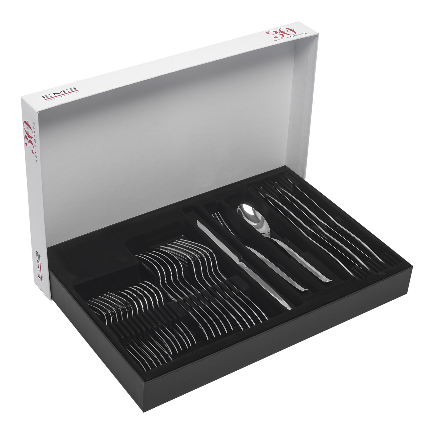 Набор EME Shark включает в себя: 6 столовых ложек, 6 вилок, 6 столовых ножей, 6 чайных ложек и 6 десертных вилок. Все приборы изготовлены из нержавеющей стали 18/10 с глянцевой поверхностью.