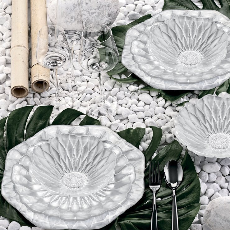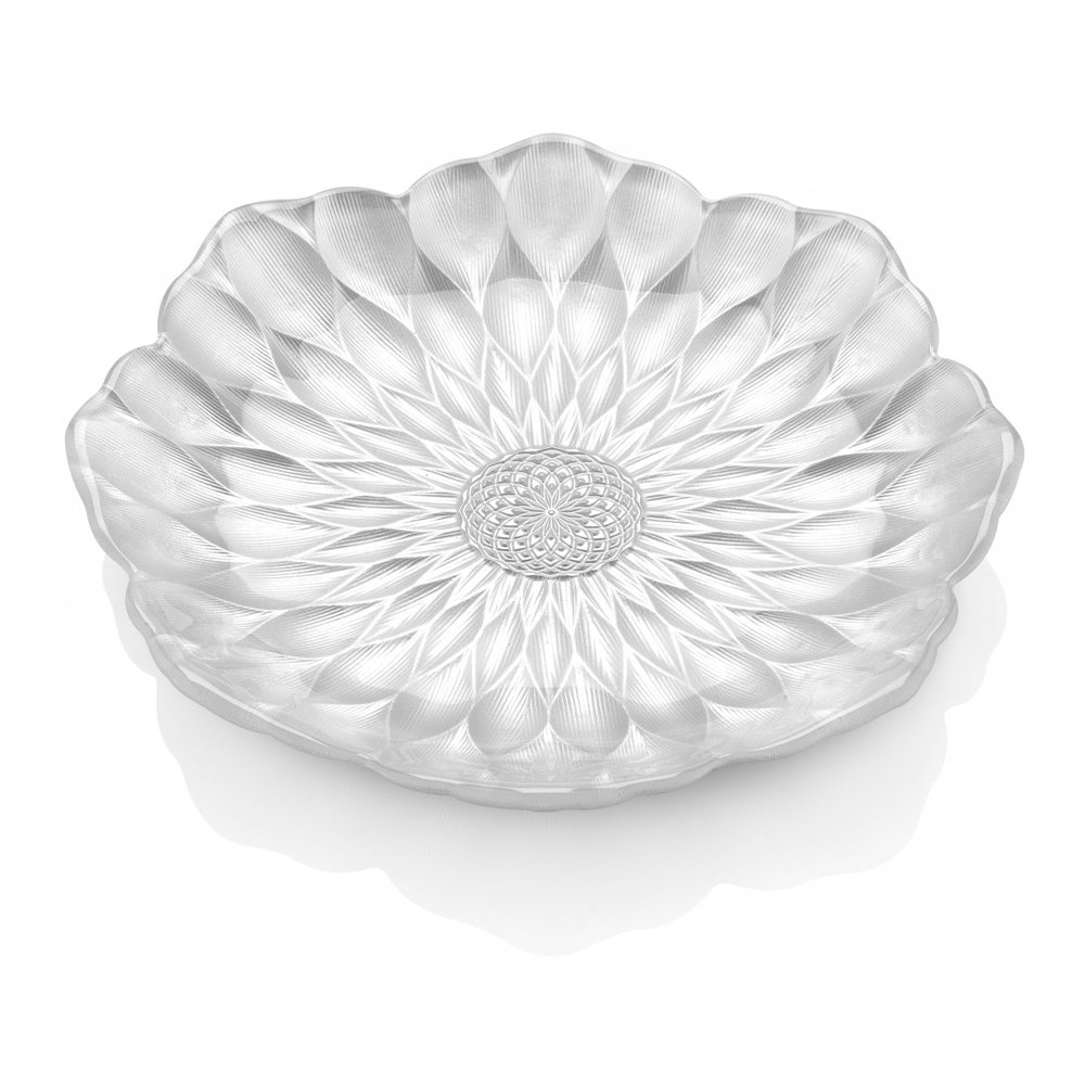 Тарелка с рельефом в виде цветка лотоса с декором белый перламутр. Боросиликатное стекло ручной работы.