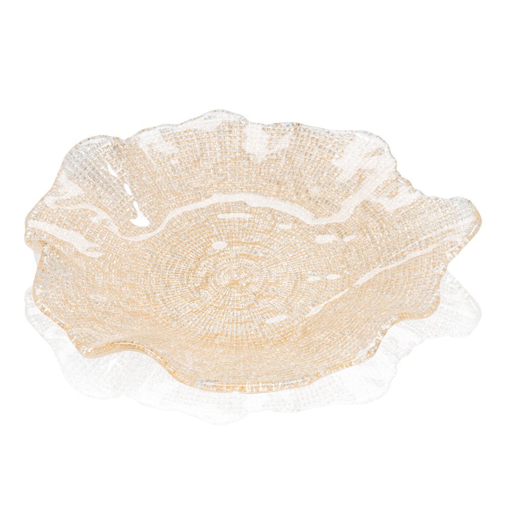 Глубокая тарелка с краями неправильной формы и рельефным геометрическим узором. Золотой декор, боросиликатное стекло ручной работы.