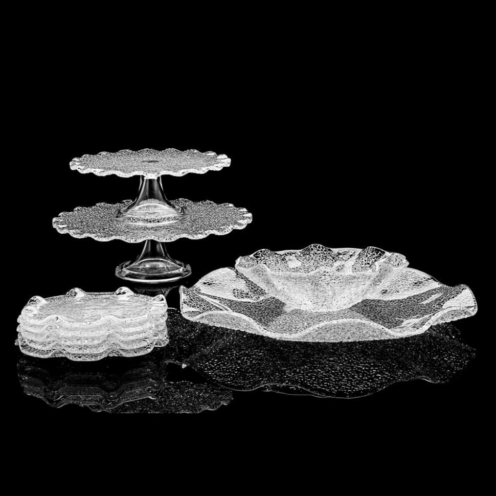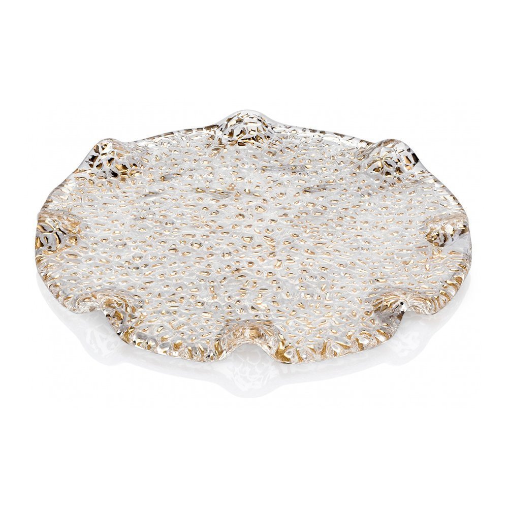 Тарелка плоская из прозрачного стекла с волнистым краем, рельефным узором и золочением с обратной стороны. Боросиликатное стекло ручной работы.
