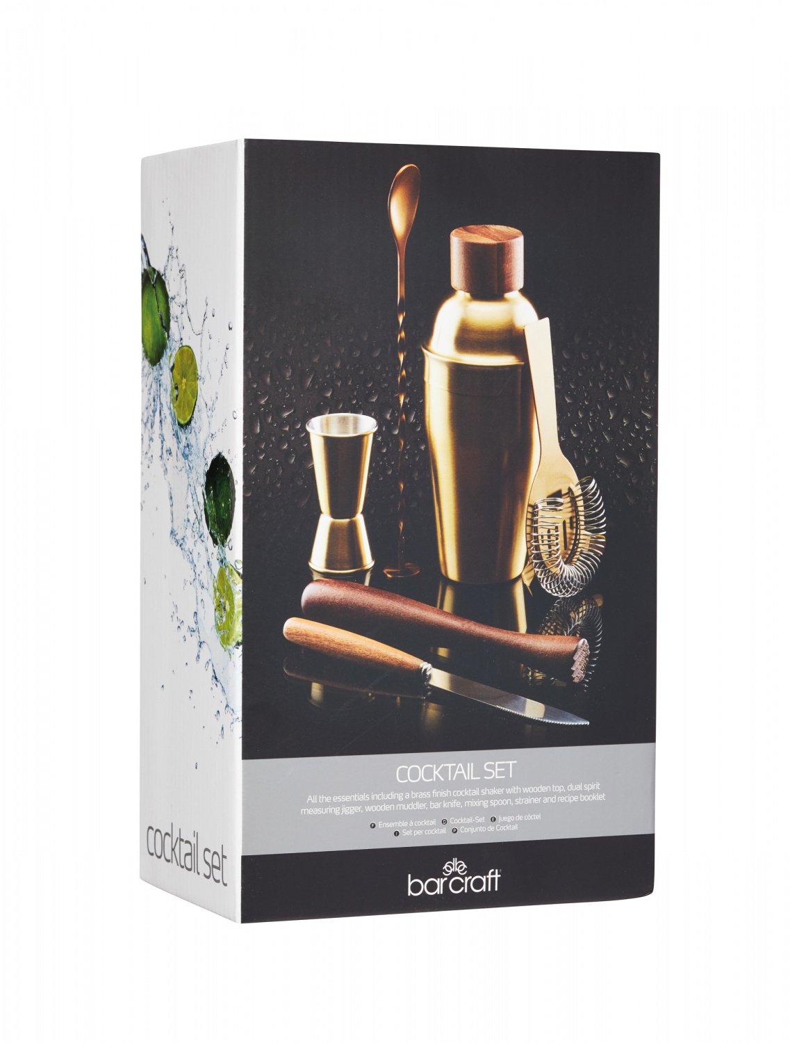 Этот набор для коктейлей из латуни с отделкой из нержавеющей стали, содержащий все необходимое для начала приготовления вкусных коктейлей, включает в себя шейкер из нержавеющей стали 450 мл из латуни с крышкой из акации, джиггер с двумя спиртовыми дозаторами, ситечко для коктейля, ложку для смешивания, барный нож и деревянный мусорник! Идеальный подарок для любого ценителя коктейлей.