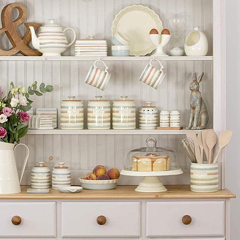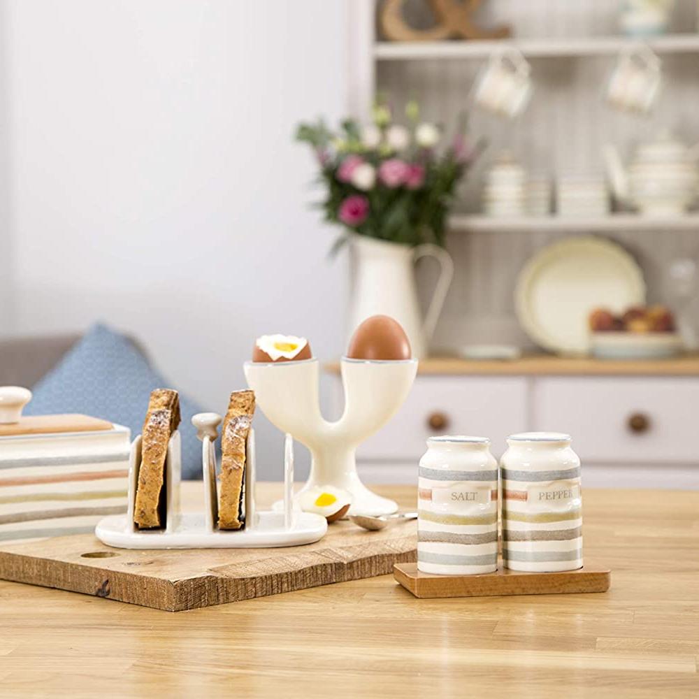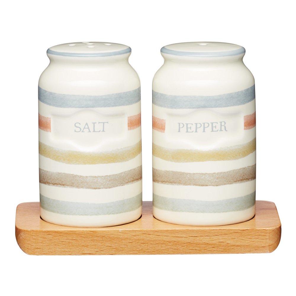 Этот набор для соли и перца на подставке, является частью коллекции Classic Collection, Они подойдут к любому интерьеру. Эти солонки и перечницы сделаны из прочной керамики с нейтральной кремовой глазурью и украшены пастельными полосками.
