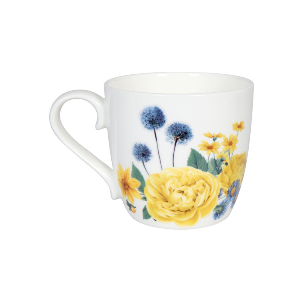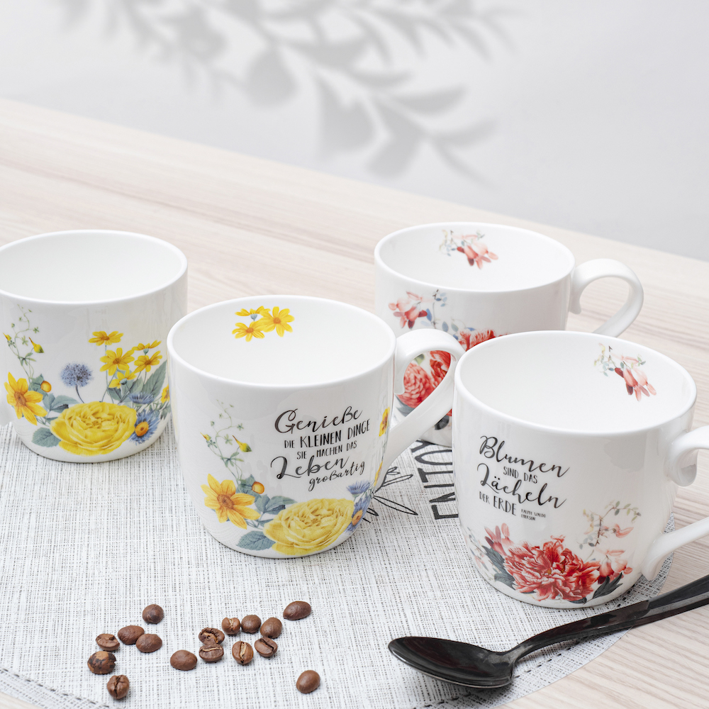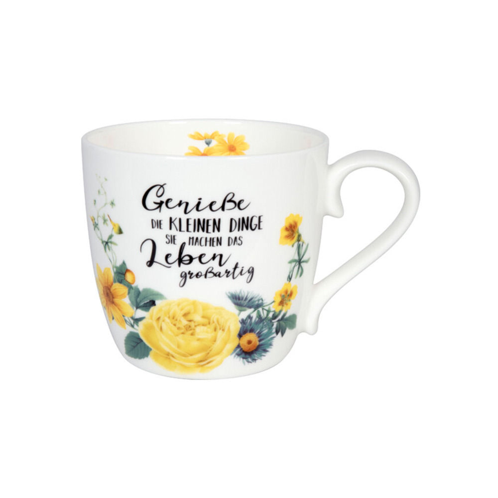 Эту яркую кружку из костяного фарфора украшают самые разные цветы желтых оттенков и немецкая пословица: «Наслаждайтесь мелочами, они делают жизнь прекрасной». Подарите эту кружку человеку, который ассоциируется с солнцем, или сделайте Ваши завтраки ярче.