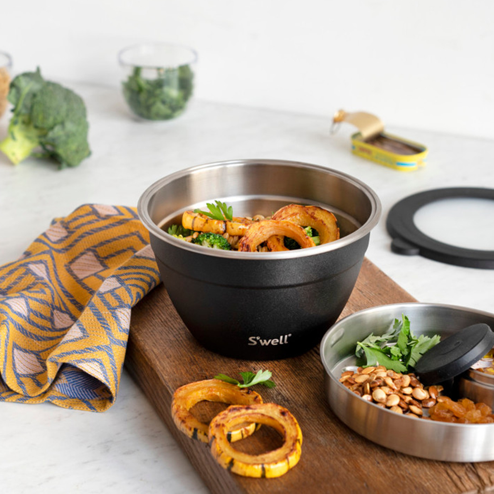 Набор для салата S'well Onyx включает в себя: салатницу объемом 1,9 л, контейнер для приправ объемом 60 мл и съемный поддон. Благодаря герметичной прозрачной крышке и контейнеру для приправ, Вы сможете сделать сэндвич с любимым соусом на работе или в дороге. Для максимальной свежести салата рекомендуем хранить контейнер в холодильнике не более нескольких часов.