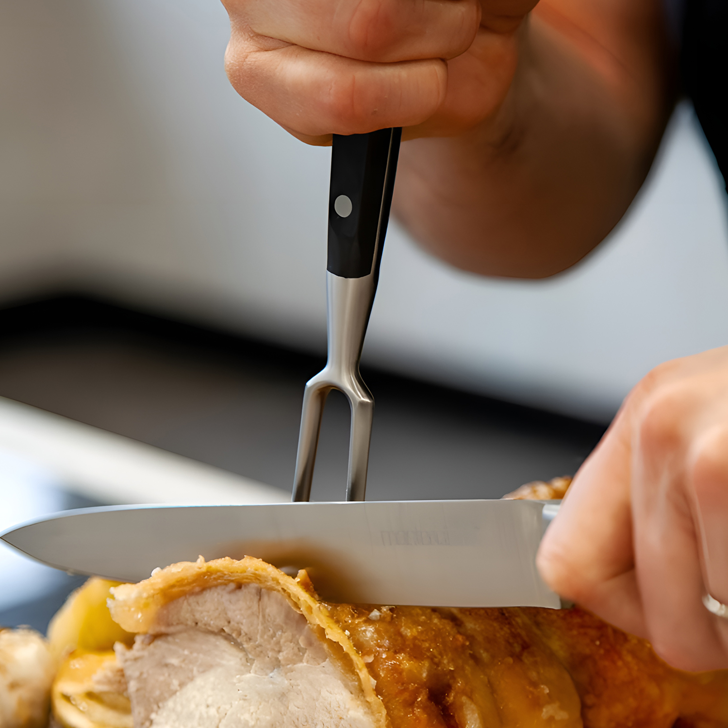 Говяжья лопатка, целый цыпленок или индейка – что бы вы ни подавали на стол, с помощью этого набора для разделки мяса из нержавеющей стали вы можете нарезать его с контролируемой точностью. Этот набор из двух предметов включает в себя разделочный нож длиной 23 см и вилку для разделки мяса длиной 13,5 см. Разделывайте мясо легко и безопасно благодаря конструкции разделочной вилки с двумя зубцами вам будет очень просто надежно удерживать мясо или птицу на месте, когда вы будете разделывать ее острым лезвием ножа. Нож оснащен режущей кромкой с заточкой. Это позволяет легко выполнять точный разрез каждый раз. Форма ручки в точности повторяет форму лезвия, поэтому при нарезке продукты не будут застревать на нем. А поскольку и нож, и вилка изготовлены из прочной нержавеющей стали, вам не придется беспокоиться о том, что они испортятся или на них останутся пятна. Идеально сбалансированы для контролируемого нарезания. Можно мыть в посудомоечной машине.