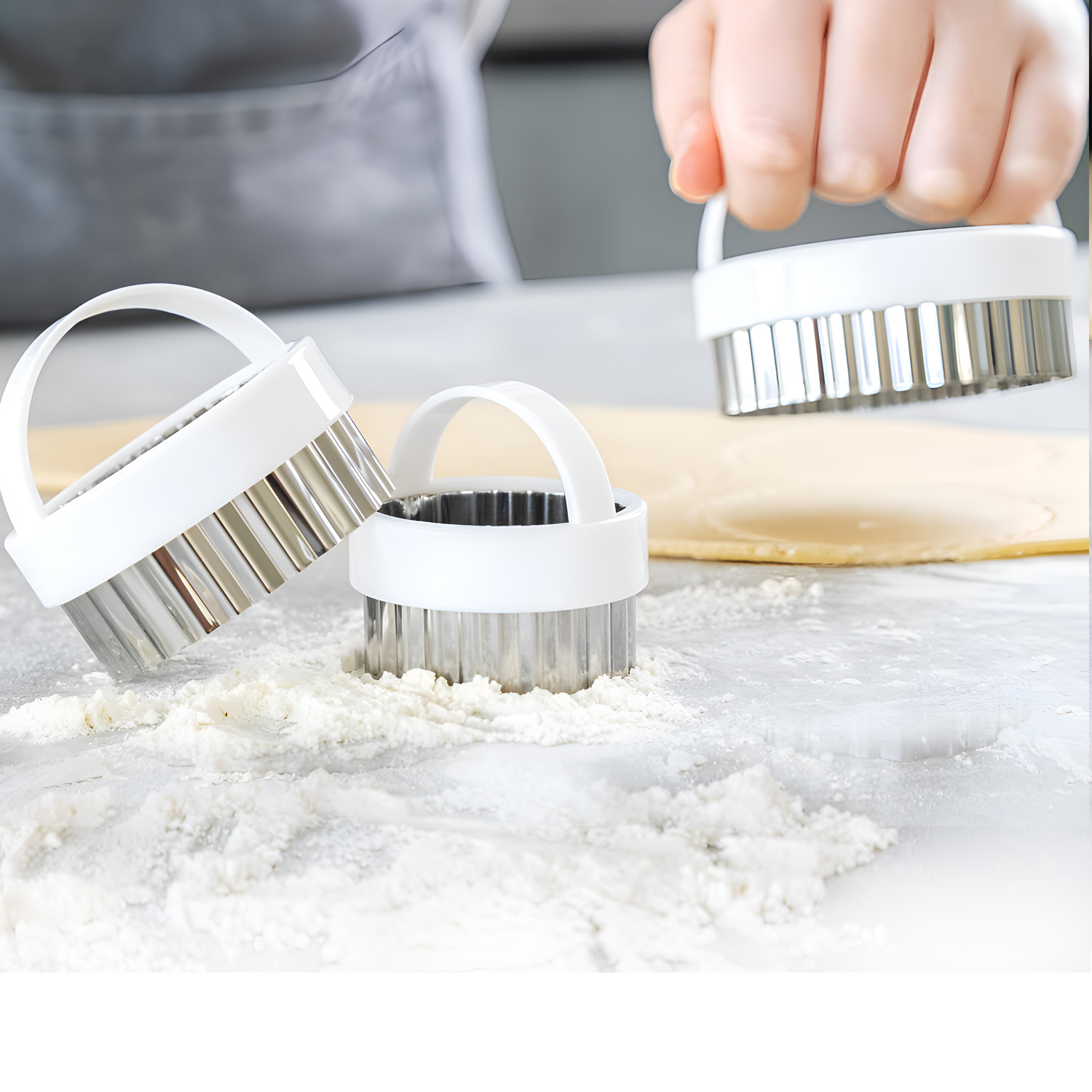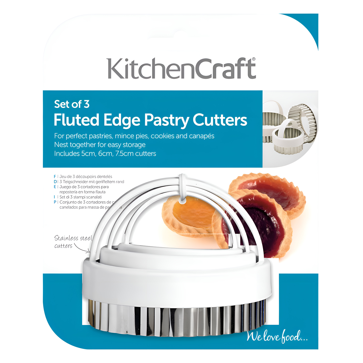 Идеальная выпечка, острые тарталетки, фантастические фруктовые оладьи, рассыпчатые пироги с заварным кремом, маленькие пироги со свининой, замечательные валлийские пирожные, аппетитные сырные булочки, вареники и очень милые канапе…Массивные пластиковые ручки в форме полумесяца на этих формочках делают их очень удобными в использовании. За них очень легко взяться, когда вы занимаетесь формованием теста, а это значит, что вы можете не касаться его пальцами. Волнистые лезвия этих формочек помогут вам создать красивые рифленые края, которые придадут изделию "идеальный" вид. Посыпьте формочки мукой, чтобы тесто не прилипало, и все будет готово. Сложный вопрос в том, что приготовить в первую очередь...? Можно мыть в посудомоечной машине