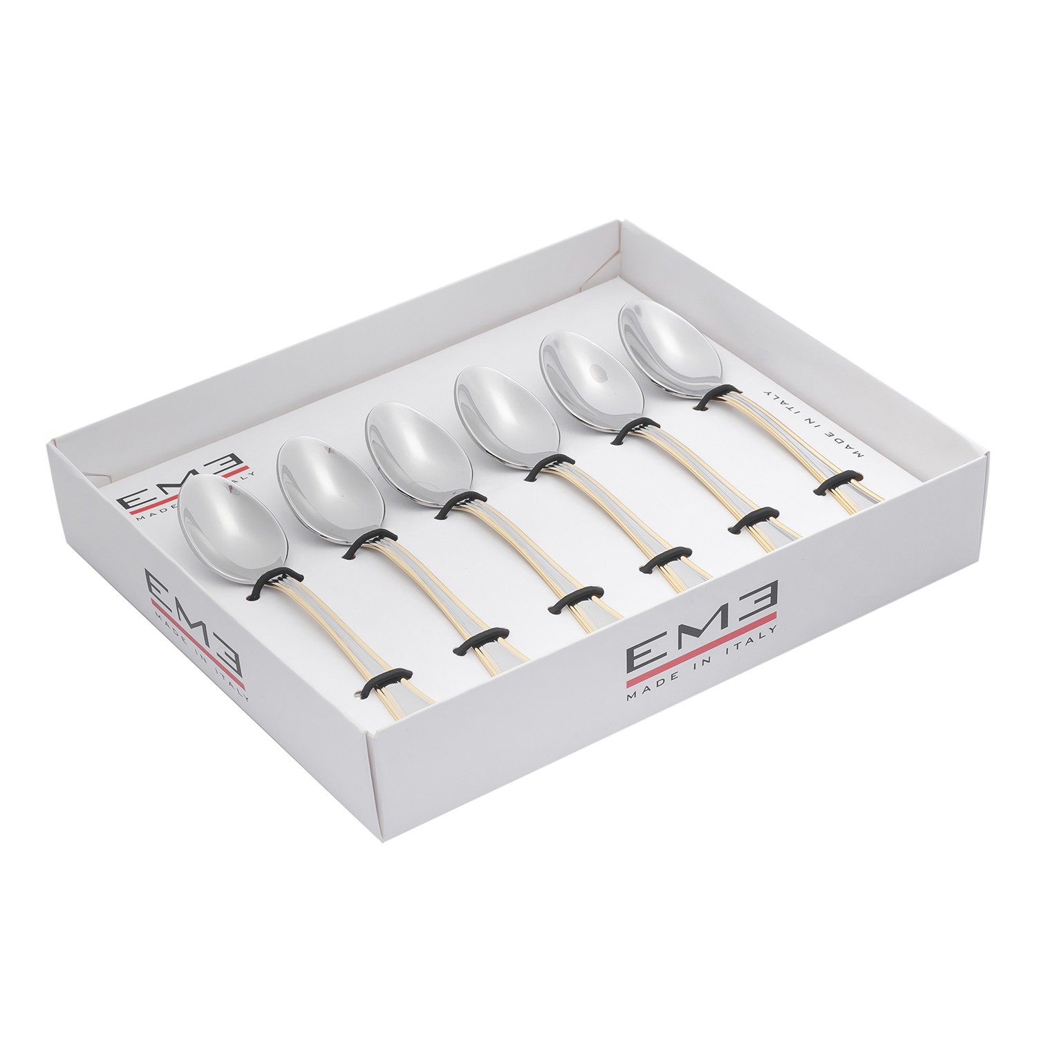 Набор из шести кофейных ложек EME Impero Oro изготовленных из полированной нержавеющей стали 18/10 с позолоченной окантовкой.