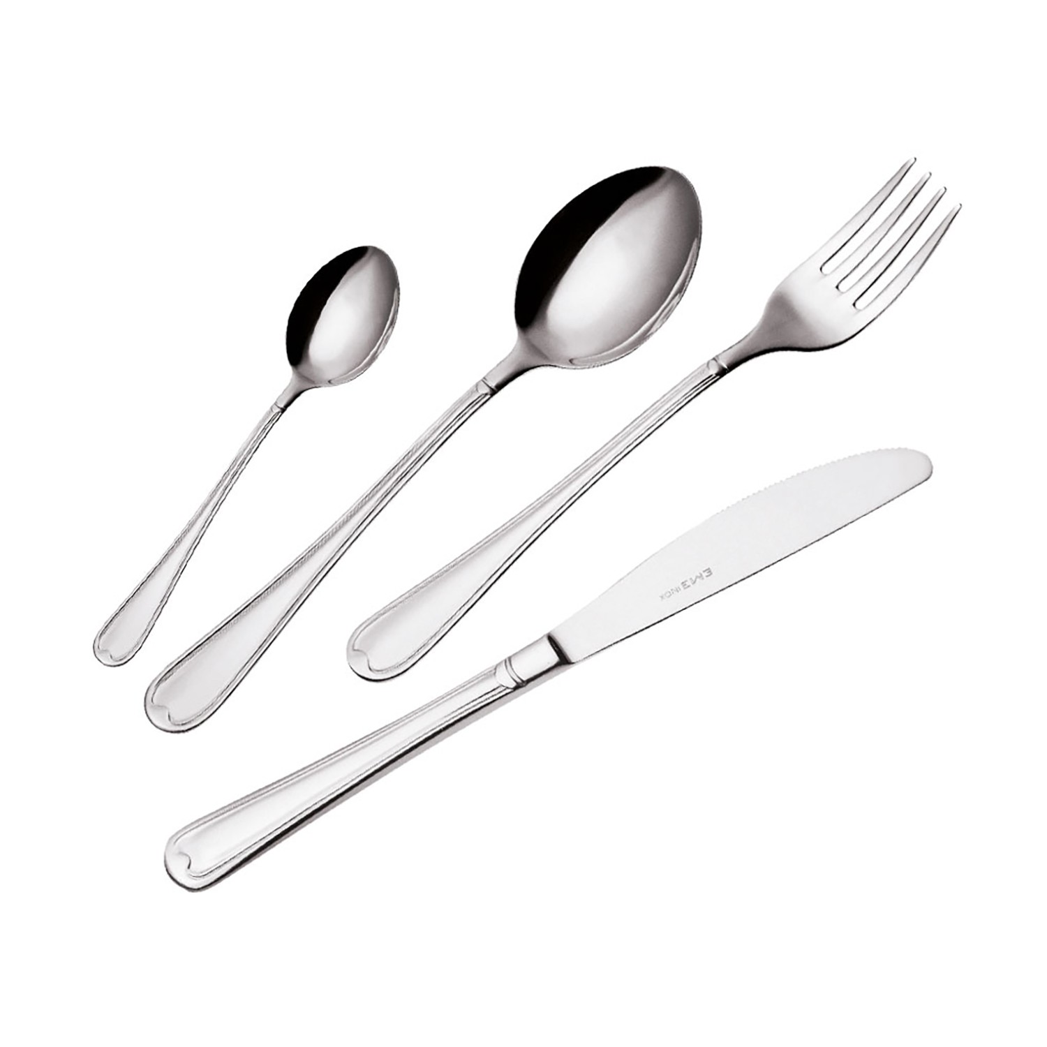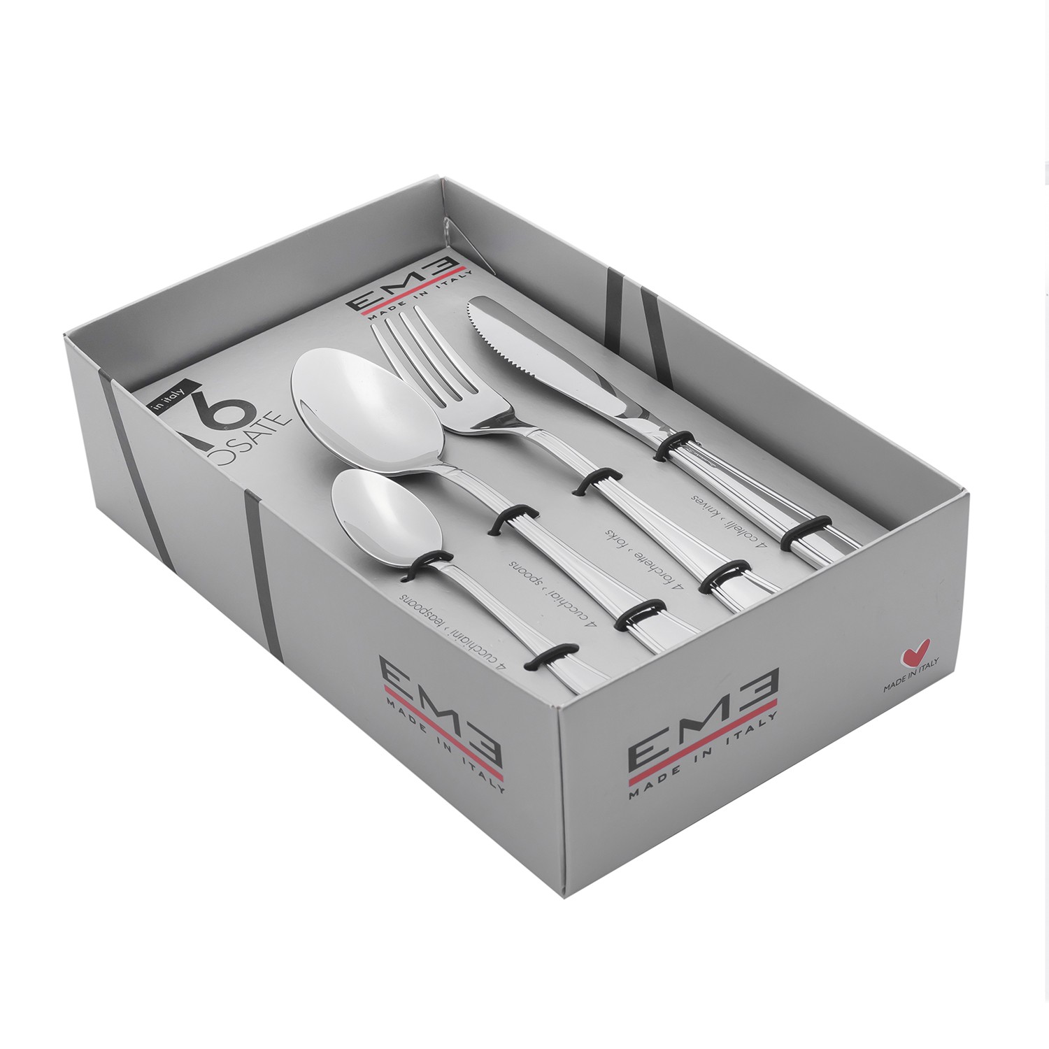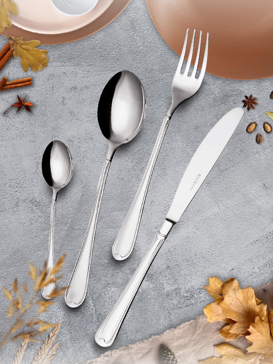 Набор EME Euro состоит из: 4 столовых ложек, 4 вилок, 4 столовых ножей и 4 чайных ложек. Все приборы изготовлены из нержавеющей стали 18/10 с глянцевой поверхностью и могут использоваться как для праздничной, так и для повседневной сервировки стола.