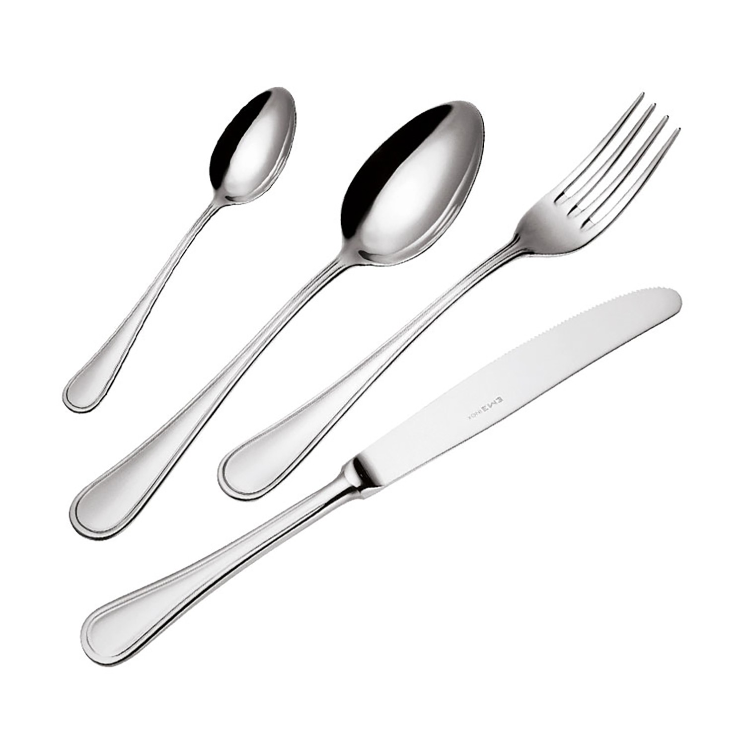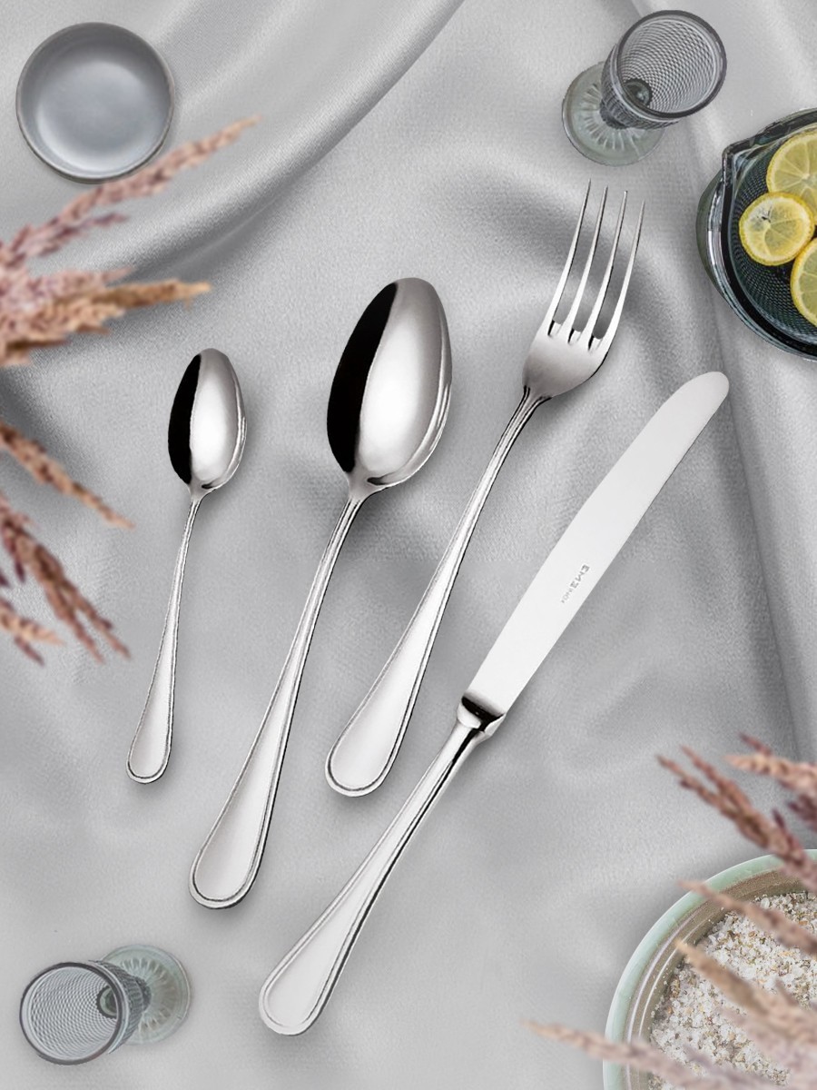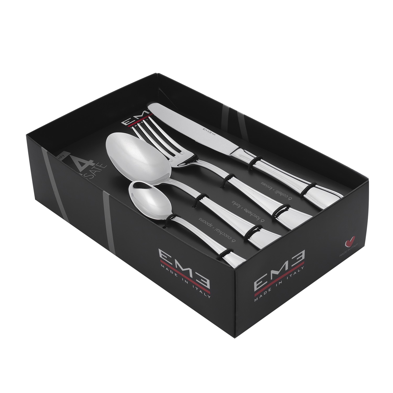 Набор EME Impero состоит из: 6 столовых ложек, 6 вилок, 6 столовых ножей и 6 чайных ложек. Все приборы изготовлены из нержавеющей стали 18/10 с глянцевой поверхностью.