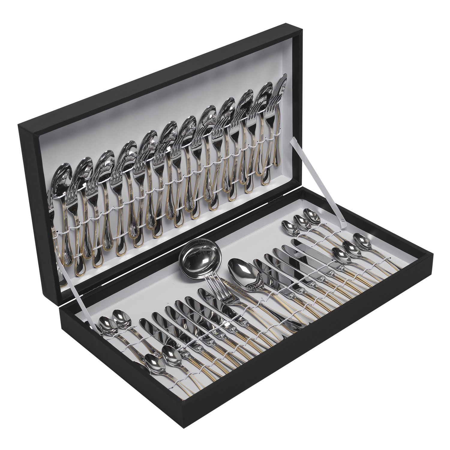 Набор EME Impero Oro включает в себя все необходимые приборы: 12 столовых ложек, 12 вилок, 12 столовых ножей, 12 ложек для кофе, 1 половник, 1 сервировочную вилку с четырьмя зубцами и сервировочную ложку. Все приборы изготовлены из нержавеющей стали 18/10 с глянцевой поверхностью и позолоченной окантовкой, нанесенной вручную.