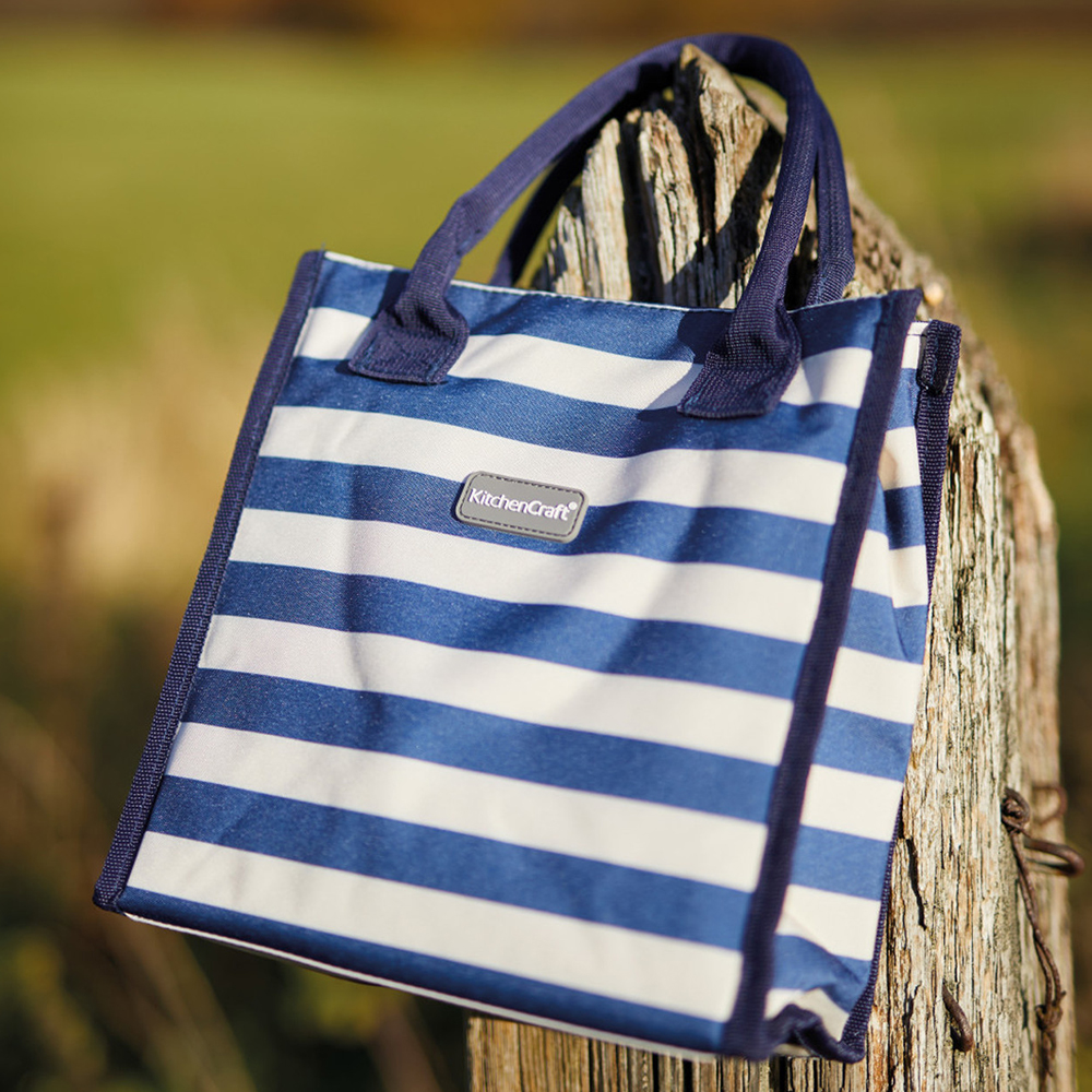 Встречайте жаркую погоду с этой прекрасной сумкой-холодильником от KitchenCraft. Благодаря термоизоляции, бутерброды и салаты останутся охлажденными до 5 часов, а супы, вторые блюда и кофе — останутся горячими. Термосумка выполнена в прохладном кремовом цвете с темно-синими полосками, вдохновленными пляжными образами. Она идеально подходит для поездок на море и для похода в супермаркет в летний день.