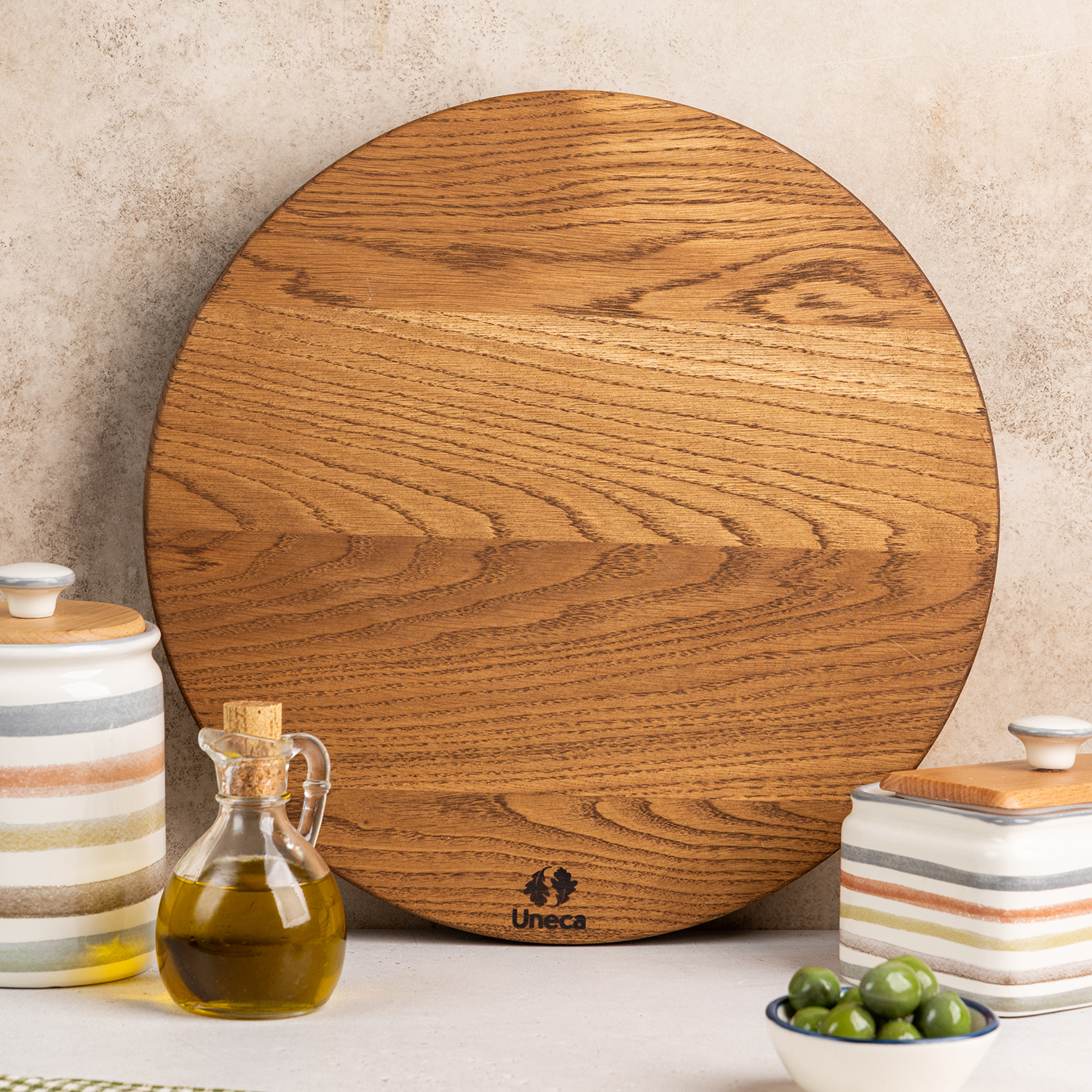 Вращающийся дубовый поднос 360º Uneca, диаметром 35 см, оснащен алюминиевой поворотной площадкой, которая выдерживает нагрузку до 70 кг! Предназначен для сервировки стола, подачи пиццы и роллов, размещения фруктов и овощей, а так же для компактного хранения баночек со специями и приправами. Натуральный дуб имеет уникальную текстуру и выразительность рисунка, что придает каждому изделию свою индивидуальность. Поднос покрыт безопасным маслом для контакта с пищевыми продуктами. Сервировочный столик имеет плавный поворот на 360 градусов, что обеспечвает доступ ко всему содержимому на нем. Благодаря размерам и функционалу, его можно использовать для подачи холодных и горячих блюд или сервировки чая, кофе, закусок, воды и напитков, как органайзер для хранения и как прекрасный декоративный элемент.